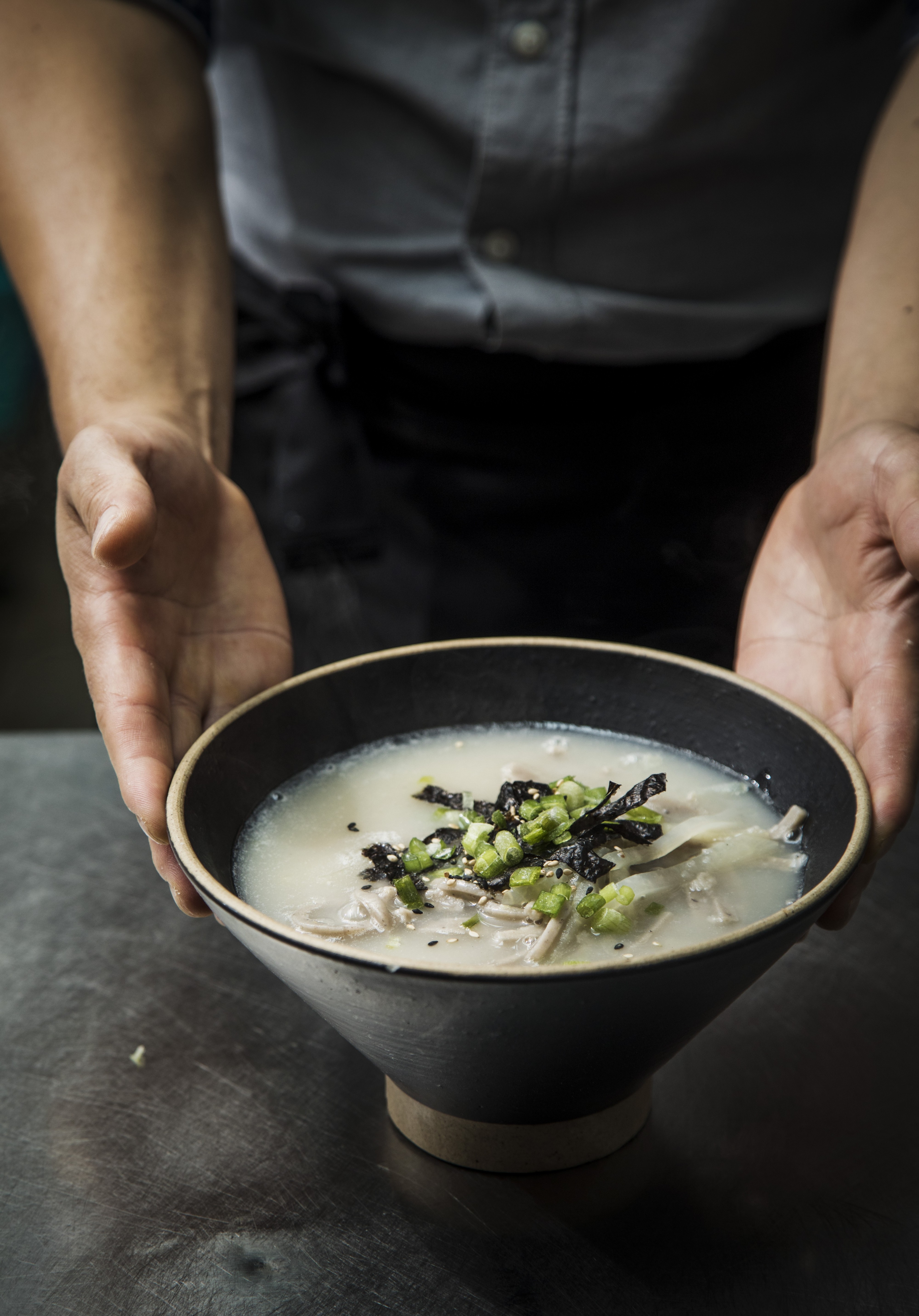 반드시 기억해야 할 맛의 포인트는 물에 푼 메밀가루. 마지막 단계에 살짝 부어 눅진한 국물을 만드는데 흡사 치킨스톡 같은 느낌. 메밀가루가 더해진 국물을 한입 머금으면 입에 착 감기는 맛이 메밀 엑기스 같기도, 꿩 엑기스 같기도 해 배지근한(제주어로 묵직하고 감칠맛 난다는 뜻) 풍미가 끝내준다. 양념은 제주답게 소금 간만 하는 것이 특징. 참기름 한 방울로 감칠맛의 정점을 찍고, 김과 참깨, 쪽파를 올려 끝까지 정성을 다한다.