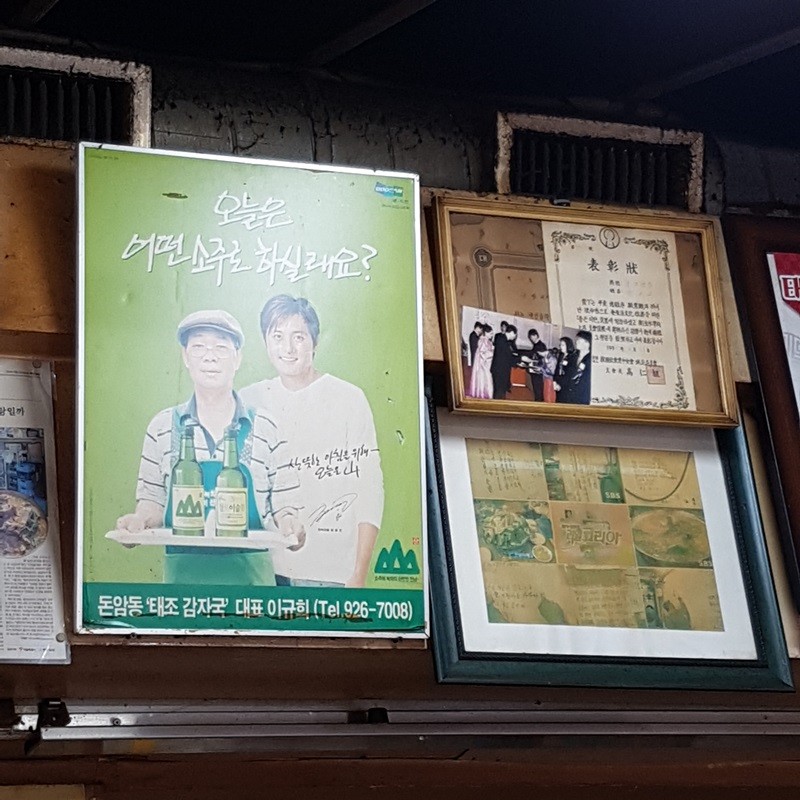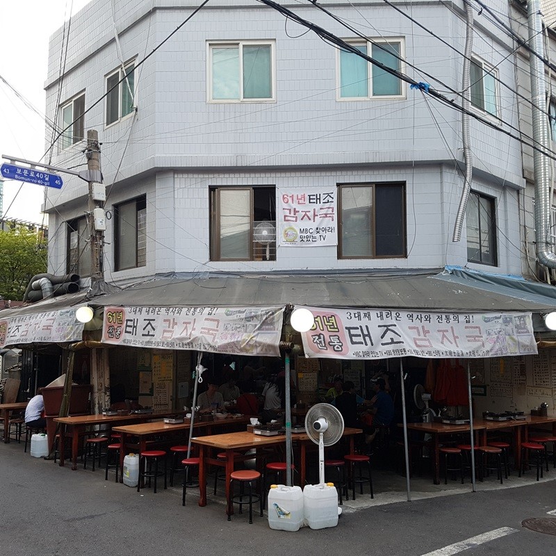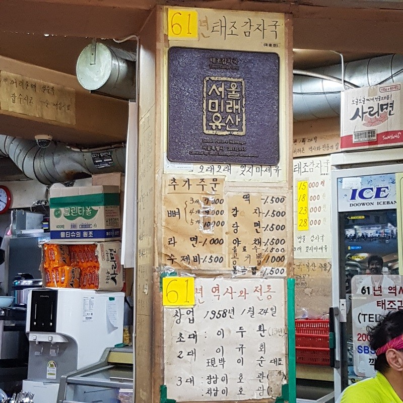 태조감자국은 한국에서 가장 오래된 감잣국집이다. 가게 곳곳에 붙어있는 선대 주인의 위트 있는 손글씨와 오랜 사진들을 보면, 1970년대 시장 한구석에 온 것만 같은 착각마저 든다. 탁 트여있는 식당에 더위가 걱정된다면, 멀리 떨어지지 않은 곳에 있는 분점을 방문해 보는 것도 좋겠다. 감자탕의 진짜 원조가 궁금하다면, 저렴한 가격에 배불리 먹고 싶다면, 돈암시장의 태조감자국을 추천한다.