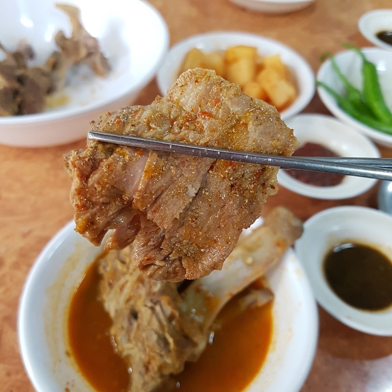 본격적으로 감잣국을 먹어본다. 이 집만의 가장 차별화된 점은 국물이 시원하다는 점. 보통 감자탕집의 국물은 등뼈에서 삶아낸 육수의 콜라겐, 감자의 전분기와 들깨 등으로 걸쭉한 국물이 많다. 하지만 태조감자국의 국물은 비교적 걸쭉하지 않고, 시원한 편. 육수에 별다른 재료를 넣지 않았기 때문일 수도 있다.